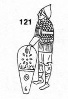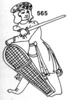 La forme est celle d’un écu normand, sauf que la base en est coupée, pour en faciliter la pose sur le sol lors des opérations de combat. Les textes nous indiquent que les hommes qui s’en servent sont généralement armés d’une lance et de javelines (souvent deux). Ils protègent les lignes.