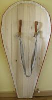 Mon hypothèse de restitution m’arrive sous la poitrine mais je pense, a posteriori, qu’il serait mieux de le faire moins haut. Il s’agit de planches de bois collés goujonnées, de façon à les cintrer. Cette base a été réalisée par Yannick Jaumard, alias Renier, un membre de l’Ost de Montjoie. Une peau de rawhide a été collée dessus, ce qui m’a valu quelques désagréments. En effet, le rawhide rétrécit lorsqu’il sèche et il a tendance à "ouvrir" le bouclier, et donc à le fragiliser. Malgré toutes mes précautions, il s’est un peu déformé au séchage, certainement à cause de mon inexpérience dans ce genre d’opération.