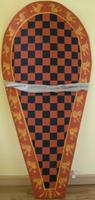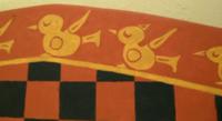 Le décor a été peint avec de l’ocre et du noir d’os, mais les pigments ont été préparés avec une technique moderne, mes tentatives de peintures à l’ancienne n’ayant pas été concluantes. Cela n’est néanmoins pas visible. Le thème est une procession d’oiseaux mâles et femelles, partant en procession des quatre fleuves du Paradis (en bas) jusqu’à leur rencontre en haut (figure 4, source figure 10)