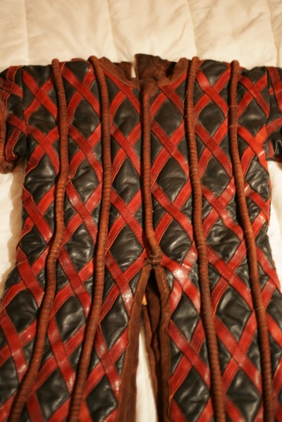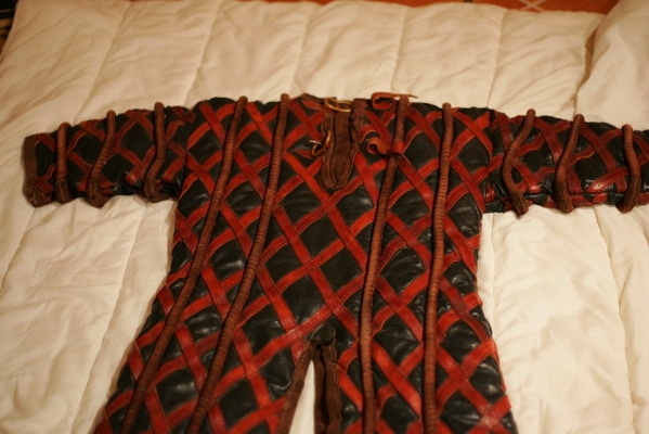 L’armure est en cuir de vachette rembourré en fourrure, avec de la peau de porc en doublure. La source est un manuscrit du troisième quart du XIIe siècle hongrois. Le rajout des cordes est une inspiration personnelle, pratique contre les armes de tranche et peu encombrante. Fabriquée par Yann Kervran