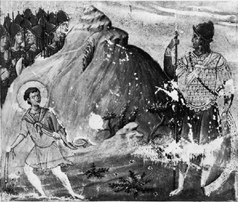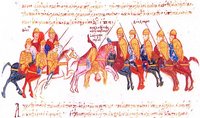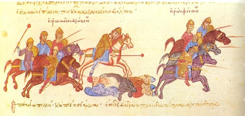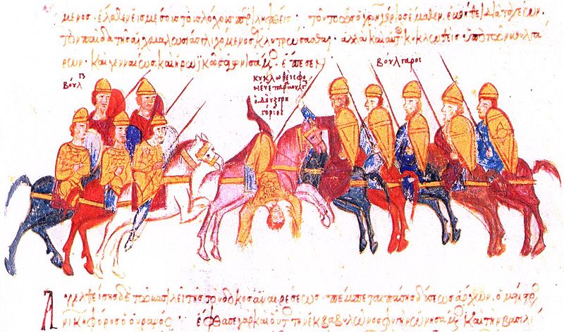 Sorte de chapel de fer orientalisé, il est très influencé par le peuple slave. Il apparait à plusieurs reprise dans le manuscrit couvrant la tête de nombre de cavaliers, qu’ils soient romains, bulgares ou russes. Il couvre le chef des troupes derrière la colline dans la scène de David et Goliath du Menologium près d’un siècle auparavant. La forme évolue plus tard et semble se démocratiser. Il apparait sur des peintures murales en provenance des Balkans datant de la moitié du XIIIe siècle, ainsi que dans le Roman d’Alexandre.