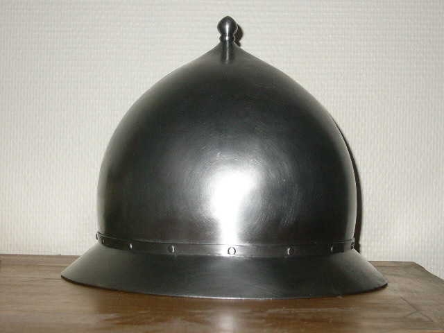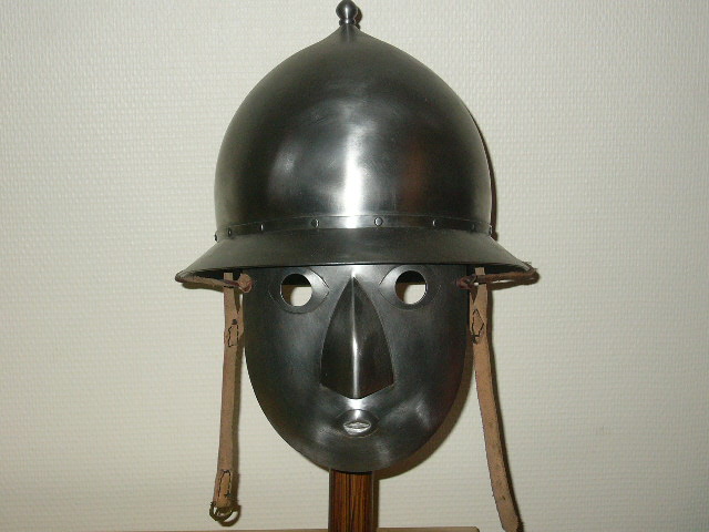 La proposition pour ce casque est basée sur une étude de sources iconographiques et notamment du manuscrit de Jean Skylitzès et le Menologium de Basil II (bien qu’antérieur à notre période de recherche). La forme de ce casque est relativement typique des protections de type chapel conique russo-byzantin.