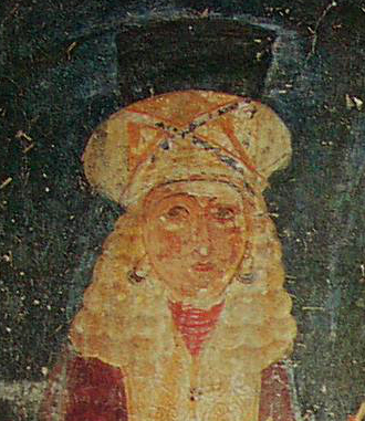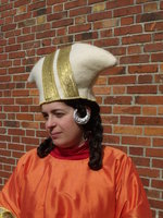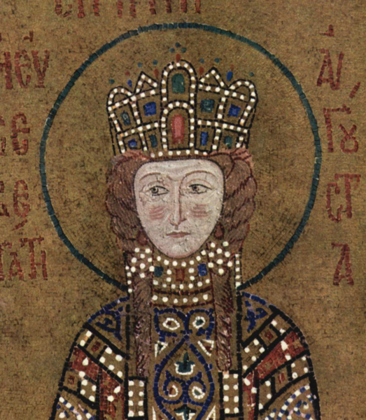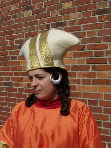 Les dames de la cour de Constantinople sont réputées pour leurs extraordinaires couvres-chef. Eudocia, en tant que dame de compagnie de l’impératrice, sait porter avec élégance ce type de coiffe, tout en arborant une coiffure recherchée et des bijoux afin de bien marquer son status social.