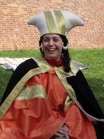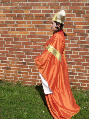 Le propoloma Le terme désigne un chapeau de forme trapézoïdale, dont les premières représentations remontent au moins au XIème siècle. Au XIIème siècle, les dames de cours le portent fréquemment [1] (Figure 1). On peut distinguer sur de nombreux exemples des bandes dorées, vraisemblablement des bandes de brocarts en particulier placées en travers. Afin de donner cette forme caractéristique au propoloma, nous l’avons réalisé en assemblant 2 parties en feutrine sur laquelle ont été cousues les brocarts. Afin de maintenir la feutrine et limiter la détente de la laine, le rebord a été stabilisé par une couture au fil de coton.