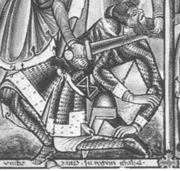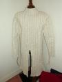 Le gambison que j’ai fais réaliser s’enfile par le bas, il est confectionné sur le modèle du haubert. Il est fendu verticalement devant et derrière pour rendre possible la pratique équestre, les pans ainsi formés descendant jusqu’aux genoux. Des triangles ont été rajouté sur les côtés pour rendre plus couvrants les pans inferieurs quand on est en selle.
