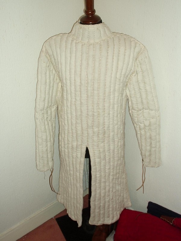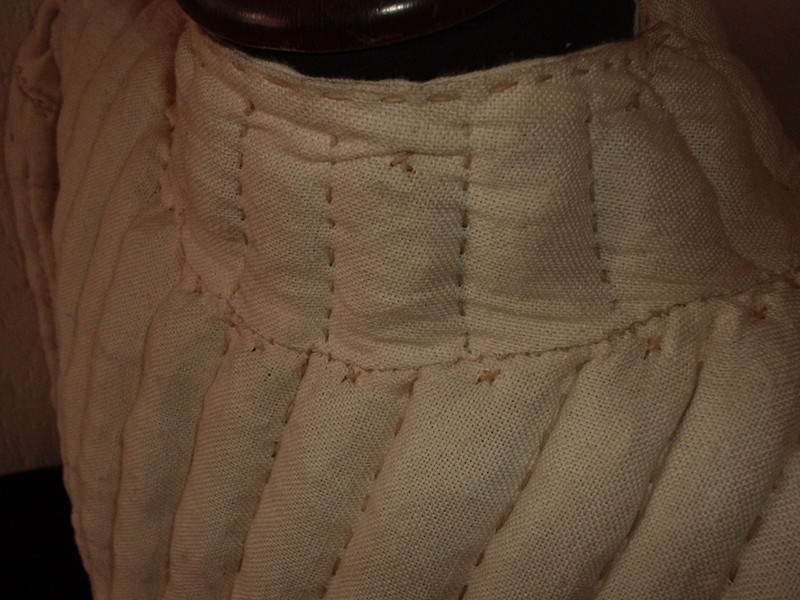 La technique employée est celle du bourrage de tubes préalablement cousus. Au final, le gambison est très raide (la mobilité n’est pas affectée, l’artisan ayant « amincie » la bourre aux articulations) , mais rellement protecteur. Cette pièce à été entierement cousue main.