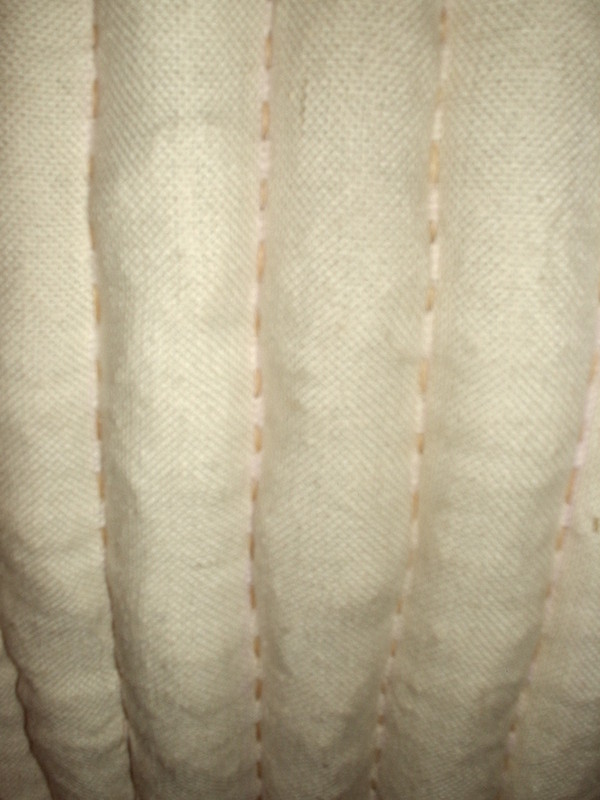 La soie est un textile très solide, dont la trame oppose une grande résistance aux déchirements et à la perforation. Pour la réalisation de ce gambison, nous avons utilisé de la « toile de soie » épaisse (non teinte) pour la face externe et une toile de lin tissé « à l’ancienne » pour la face interne.