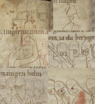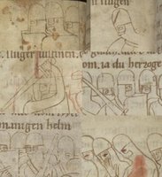 ![]() « Rolandslied des pfaffen Konrad », 1170, Allemagne, University Library, Heidelberg, Ms Cod. Pal. Germ. 112 397 x 434 px 28.3 ko Au sein de ce manuscrit allemand, daté autour de 1170, on peut observer de nombreux exemples de Joieres. |