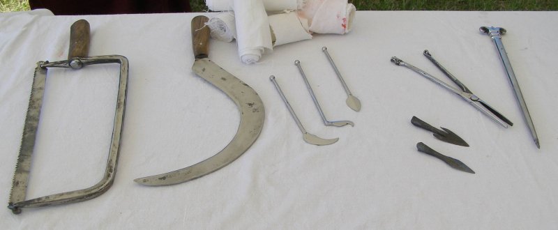 La trousse chirurgicale (Figure 2) comprend à ce jour des outils utilisés lors d’une amputation (une scie, un couteau à amputer), d’une trépanation (une tréphine), d’une cautérisation (cautères à usage externe et interne) ainsi que pour l’extraction des flèches (pince dite « à bec de corbin »). Cet ensemble est destiné à être régulièrement complété.