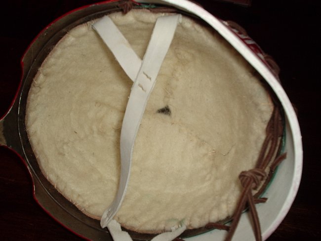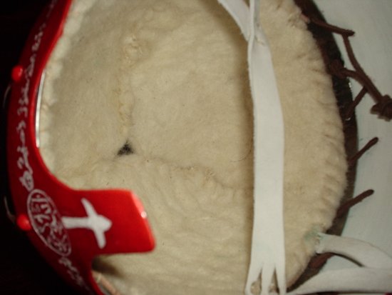 Pour terminer le casque, j’ai cousu une garniture en feutre de chèvre naturel à l’intérieur. Ce type de garniture isole et assure un maintien très confortable. Enfin une plume de queue de faisan (volatile dont parle de Al-Tarsusi pour ces plumes) à été fixé dans l’orifice de l’apex pour terminer l’ouvrage.