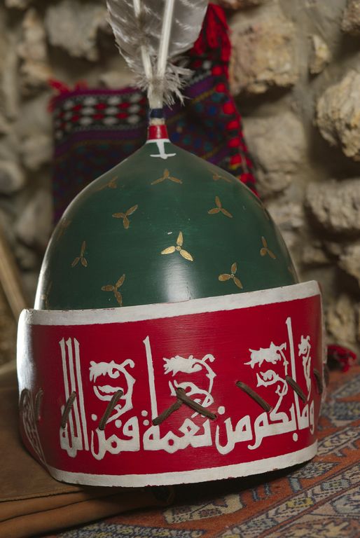 L’inscription de la plaque de nuque signifie : « toute les bénédictions viennent d’Allah ». L’inscription à droite du nasal « Anf » en arabe signifie : Coran verset [5:121] « A Allah appartient le royaume des cieux et de la terre et il est en eux ; et il a le pouvoir sur toute chose ». L’inscription centrale signifie : « Allahu_Akbar » L’inscription à gauche du nasal signifie : Coran verset [5:99] « Saches qu’ Allah est sévère dans sa punition et qu’Allah est aussi le plein de pardon et de pitié ».