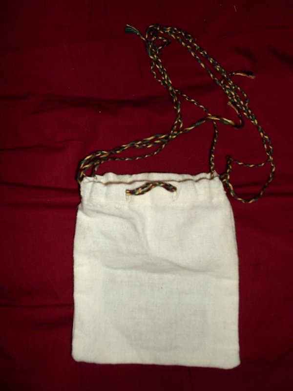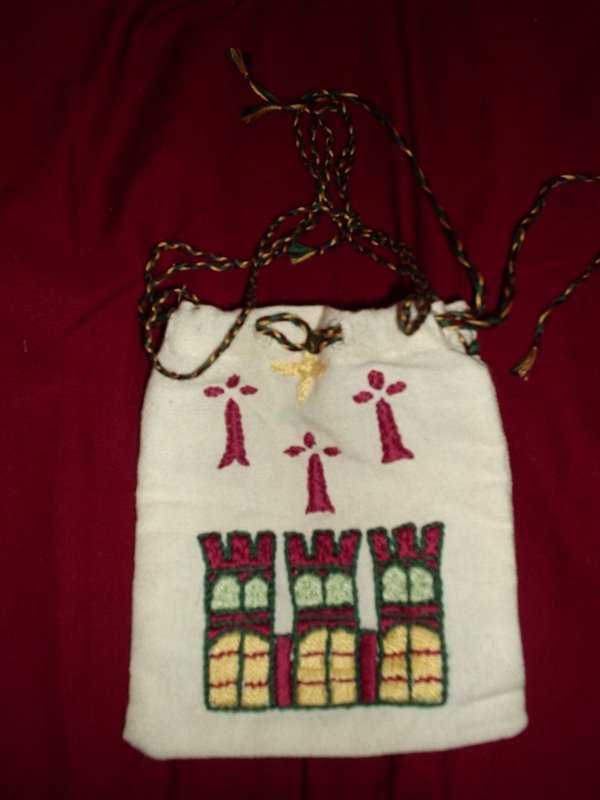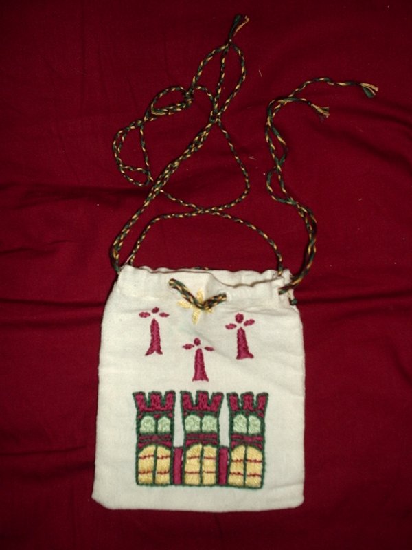 Jehan le Podestat est un miles de rang supérieur à la court du Comte de Tripoli aussi il lui arrive de faire l’aumône aux pauvres. Il possède par conséquent une aumônière. Pour réaliser cette aumônière, je me suis principalement inspiré de deux sources. L’une est conservée au musée de la ville de Chelles (77), il s’agit d’une aumônière de mariage datée vers 1180 qui figure une scène de « tristan et Iseult ». La deuxième source est une aumônière au décors guerrier conservée dans le trésor de la cathédrale d’Auxerre. L’aumônière du Podestat est un petit sac en lin, de 16cm x 13cm, qui a été brodé de trois hermines rouge qui représentent les armes personnelles du Podestat. J’ai brodé également une ville à trois tours qui figurent les armes supposées du comte de Tripoli à la fin du XIIème siècle (aucune source ne nous éclaire sur les armes du comté de Tripoli en 1186. Si vous possédez cette information ou des pistes intéressantes contactez nous). Un cordon de coton tressé permet de fermer l’aumônière.