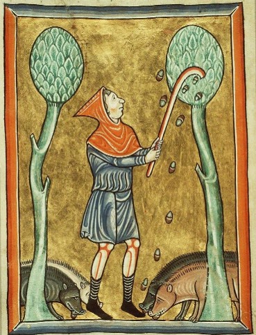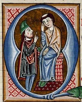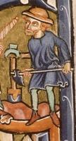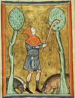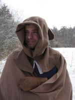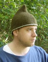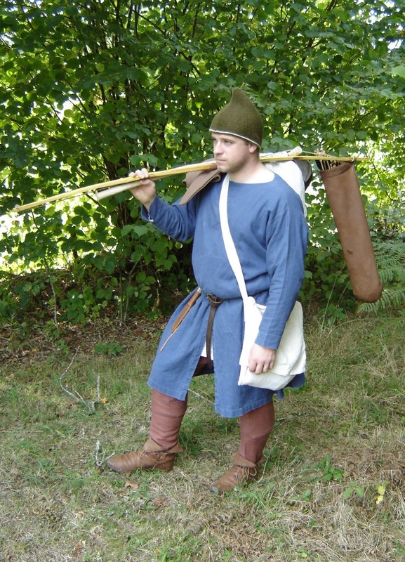 Son couvre-chef, dont la forme est typique du XIIe siècle, est d’un tissu de laine brodé sobrement en adéquation avec son rang modeste.