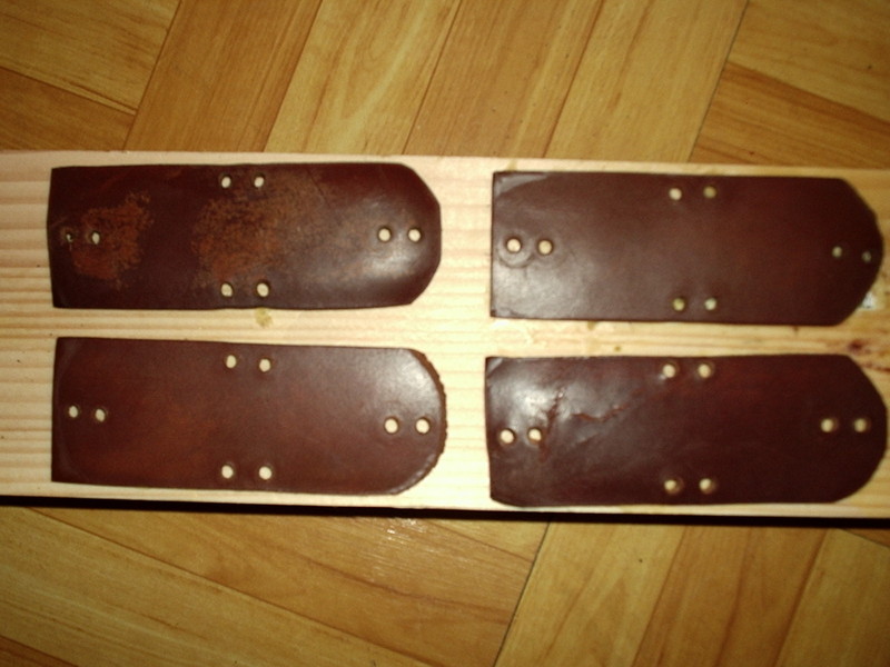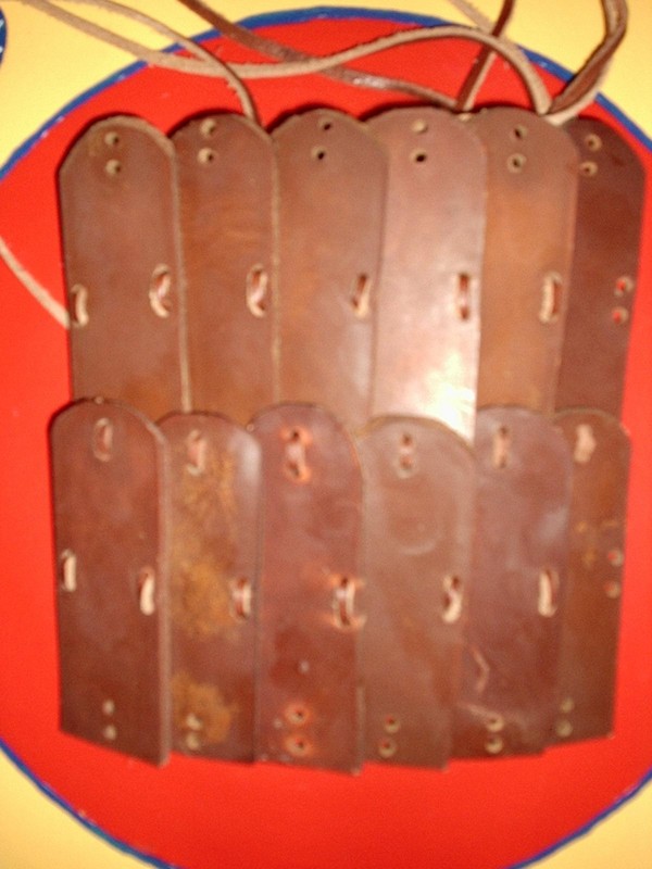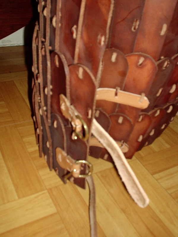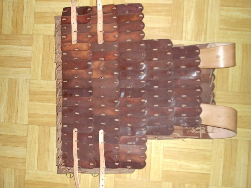 Pour la réaliser, j’ai utiliser une peau tannée végétale de 4mm d’épaisseur. Une peau de bovin malheureusement, une peau de chameau ayant été plus indiquée. J’ai découpé des lamelles de 4cm X 10,5cm. J’ai ensuite découpé avec un emporte pièce la partie supérieures de la lames (2). J’ai percé à l’emporte pièce 8 trous par lames. J’ai bouilli ensuite les lames avec de la cire d’abeille naturelle. Après les avoir laissé refroidir, j’ai assemblé les lames entre elles à l’aide d’un fil de cuir. J’ai utilisé environ 160 lames pour confectionner cette « Jawshan ». Des sangles avec boucles finissent l’ouvrage permettant sa fermeture de chaque côté. J’ai préféré mettre les ouverture sur les cotés, car les traités de « Furusayya » (art de la guerre) indiquent que le guerrier doit être capable de de mettre et d’enlever sa Jawshan au galop... un laçage arrière interdit je pense cette délicate opération...