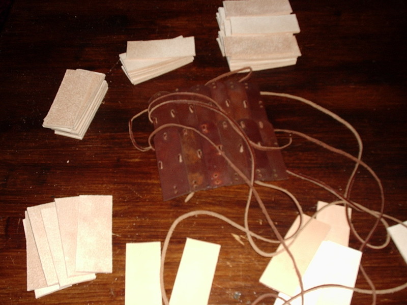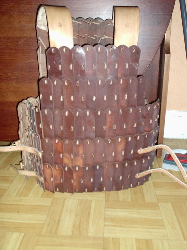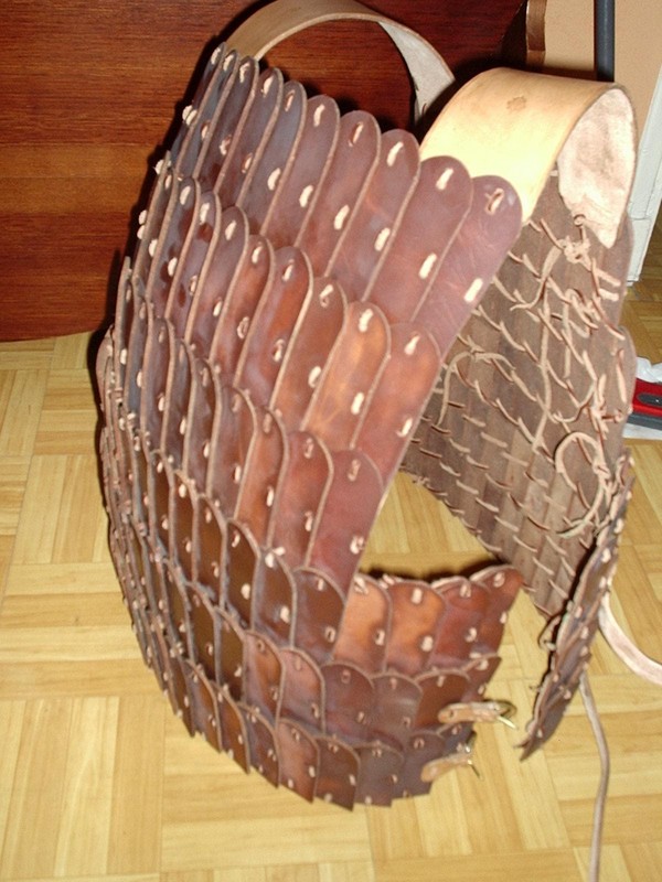 Al-Tarsusi (1) nous dit que que leur construction est réalisée généralement par des artisans persans qui usent de lames métalliques, de cuir ou de corne. Pour les armures retrouvées (dans une cache d’arme), sur les dix, deux sont en métal. Elles sont constitués de cercles de lamelles rattachés les uns aux autres. Beaucoup présentent des traces de peintures ou d’inscriptions peintes. Le « Warqa wa gulsha » dépeint egalement des lamellaire de couleur (bleu et or notamment). On distingue deux type d’assemblage. Le premier se compose de plusieurs de « cercles » de cuir, durcis et stratifiés, liés entre eux par des lacets. Le deuxième type se compose de petites plaques de cuir rectangulaire assemblées par un laçage plus ou moins complexe. Les lamellaires du premier type possèdent généralement une pièce garantissant la nuque. La plupart de ces pièces conservent des traces de peinture ou de laque de couleur. Des inscriptions ou des dessins figurent sur certaines d’entres elles. Beaucoup de jawshan au XIIème sont représentées sans tassette ou d’épaulière comme on peut l’observer sur le manuscrit « Warqa wa gulsha » (Topkapi Library, Ms Haz. 841 Istanbul, Turquie), elles garantissent le buste uniquement. Quelques sources nous renseignent sur l’emploi de lamellaires plus lourdes, généralement en métal et munies de tassettes et de jupes. Ces dernières étaient certainement reservées à la cavalerie lourde (’Mudajjaj’, "marche lente" en arabe) qui n’était pas équipée de l’arc. En effet les tassettes gênent l’armement de l’arc et la jupe rend inconfortable le tir retourné en selle. Vu que mon « Ghulam » est membre de la cavalerie légère, j’ai opté pour une lamellaire en cuir bouillie. Son statut d’archer monté lui interdit les tassettes et la jupe.