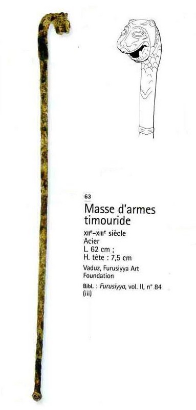 ![]() Sources 428 x 893 px 27.5 ko source1 : masse détenue par la Furusiyya Art Fundation (Vaduz). Il s’agit d’une « Latt » perse de la fin du XIIème - début du XIIIème, en acier (70cm), avec une tête zoomorphe de lion source2 : Tête de masse zoomorphe en bronze (County museum of art, Los Angeles) |