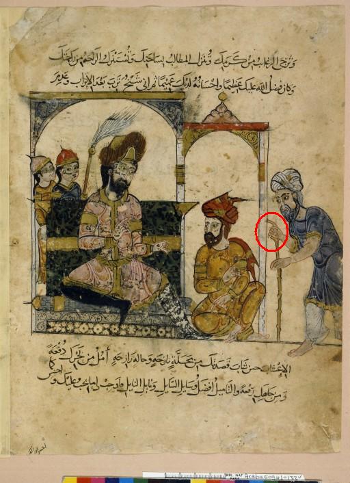 Mis à part l’iconographie, où il est représenté très fréquemment, les sources écrites nous renseignent pauvrement sur cette usage. Il est difficile de connaître la formule orale qui devait l’accompagner. Néanmoins en s’appuyant sur « les mémoires d’Usamah ibn Munqidh » on imagine que cette formule revêtait à caractère religieux. On relève dans l’oeuvre, par exemple, les formulations suivantes : « ... qu’Allâh t’ai en pitié !... », « ... la grâce d’Allâh sur toi !... » ou « ... pars en paix avec Allâh le très haut... ». Sur la signification du geste lui même, l’hypothèse du lien religieux est la plus probante. Si on se base sur l’étude menée par Mr Battesti (1) sur la communication gestuelle Yéménite, ce signe désigne Dieu lui-même. « Dieu : Il est souvent désigné de l’index tendu vers le ciel. Ce geste est le terme d’une série qui commence par l’énoncé complet de la shahâda, qu’on peut réduire au nom Allâh, puis à la syllabe Lâh qui est aussi le nom de la divinité, au son Ah, et si on ne peut plus parler, par exemple à l’article de la mort, à l’index dressé, et enfin, si on ne peut plus dresser le doigt, à l’esquisse du geste »
