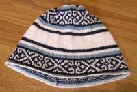 Le tricot a été réalisé, comme ma ceinture, par ma mère au point de jersey, décor en jacquard, avec un coton très fin bleu foncé, bleu cyan et blanc.