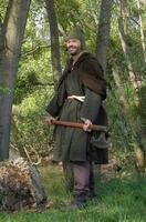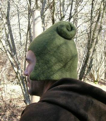 Son costume est simple (Figure 1) : il comprend une chainse et des braies de lin, des chausses de laine marron, un bliaut de laine verte, un manteau à capuche de laine marron et un couvre-chef en feutre vert.