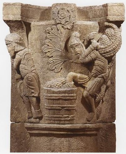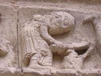 L’ensemble s’inspire d’une sculpture ornant la façade de l’église d’Aubeterre-sur-Dronne (Figure 2). Le décor montre un bliaut porté sous un manteau à capuche. Celui-ci est maintenu rejeté sur les épaules grâce à une ceinture, dégageant ainsi les bras et rendant le travail plus aisé.