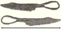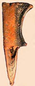 Le fourreau, inspiré de la forme d’une pièce de fouille, est en cuir tanné à l’écorce de chêne bouilli à la cire et cousu au fil de lin poissé.