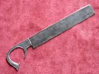 Reproduction en acier d’une scie iranienne, datant des XIe -XIIe siècles (en bronze). La taille de l’original (24,13 cm) suggère que cela pouvait être un instrument chirurgical.