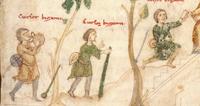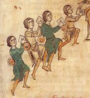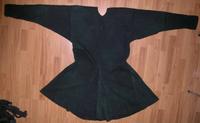 L’autre source qui m’a servi est le Liber ad Honorem Augusti, dans lequel des messagers sont représentés comme portant des tenues similaires à ce type de tunique. Comme aucune décoration n’y est représentée, j’ai décidé de n’en faire aucune non plus. Enfin, j’ai choisi le vert comme couleur pour teindre mon étoffe, afin de faire allusion justement aux couleurs du Liber, bien que je sois parfaitement conscient que l’emploi de cette couleur dans le manuscrit ne renvoie absolument pas de façon certaine à une réalité matérielle.