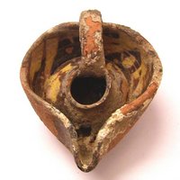 En Terre Sainte, l’utilisation de lampes en terre cuite tournées remonte à l’Âge de Bronze (figure 2). Si les périodes hellénistique et romano-byzantine voient une large diffusion des lampes moulées avec décorations sur la partie supérieure, les périodes islamique et croisée marquent le retour de la lampe tournée avec l’apparition de la lampe dite "soucoupe" ou "ruche". Ce type de lampe, sur une base de lampe coupelle (figure 2), ajoute un réservoir et est munie d’une anse (figures 4-5, 8-9). Si les modèles islamiques montrent des réservoirs de taille variable (figures 3-4), peut-être une évolution d’un modèle primitif (figure 3) vers un modèle plus évolué (figure 4), les lampes associées à des établissements latins sont en général pourvues d’un réservoir assez large (figure 5).